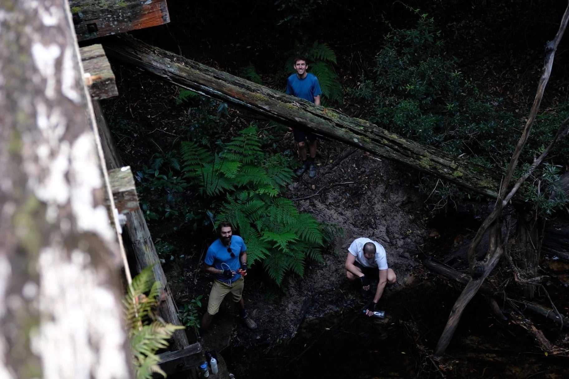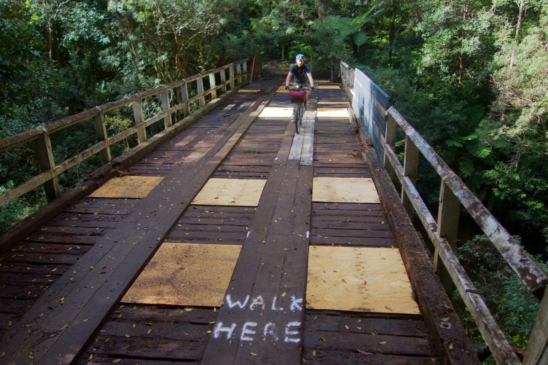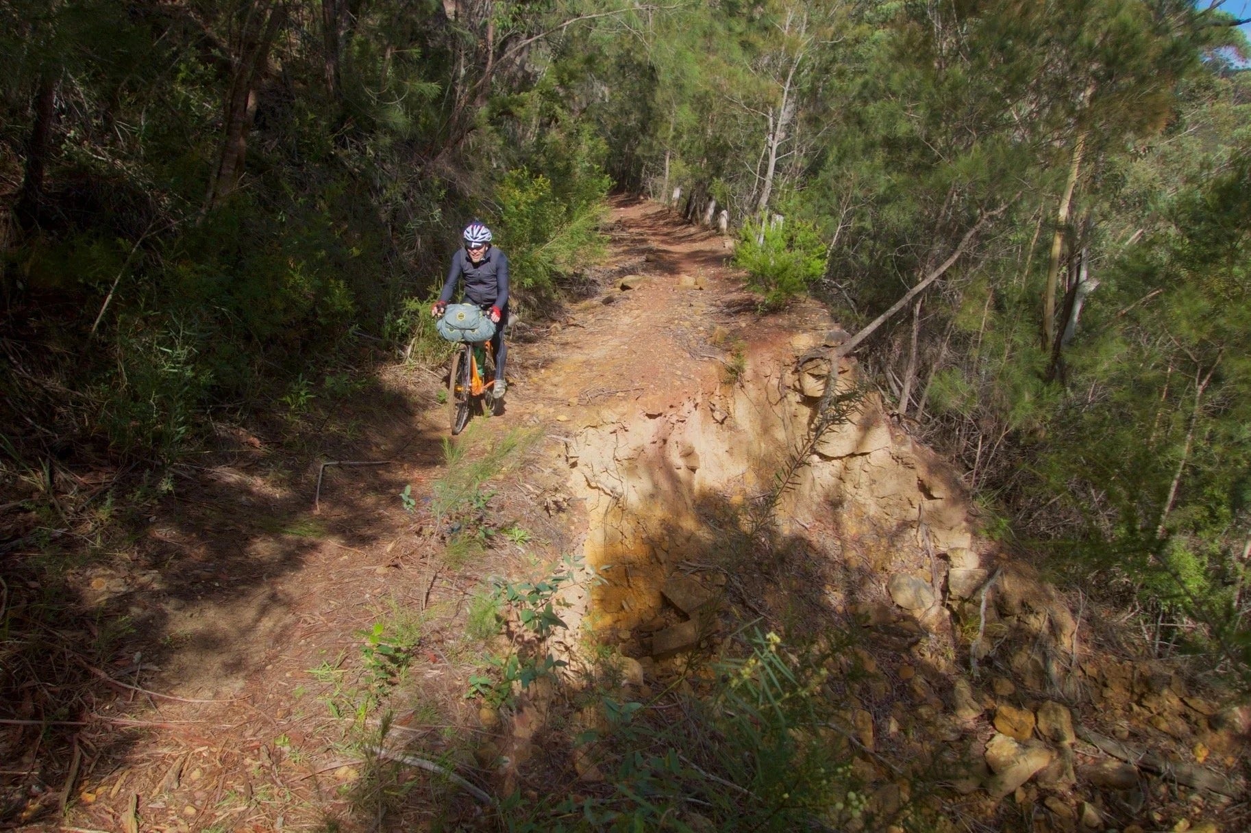Past the town, there are some long downhill sections on the road (and short ups) that take you to the Mount Irvine turnoff. Keep going as the road turns to dirt, past the "ROAD CLOSED" signs (at your own risk of course). Descend down to Bowens Creek, and very carefully cross the rotting wooden bridge (stick to the newer planks of wood). [Edit: This bridge was destroyed in the 2020 bushfires. You can wade the creek upstream of the bridge.] On the other side you'll find the disused Mount Irvine fire trail, which zig-zags up through wash-outs and ruts to the Bells Line of Road.