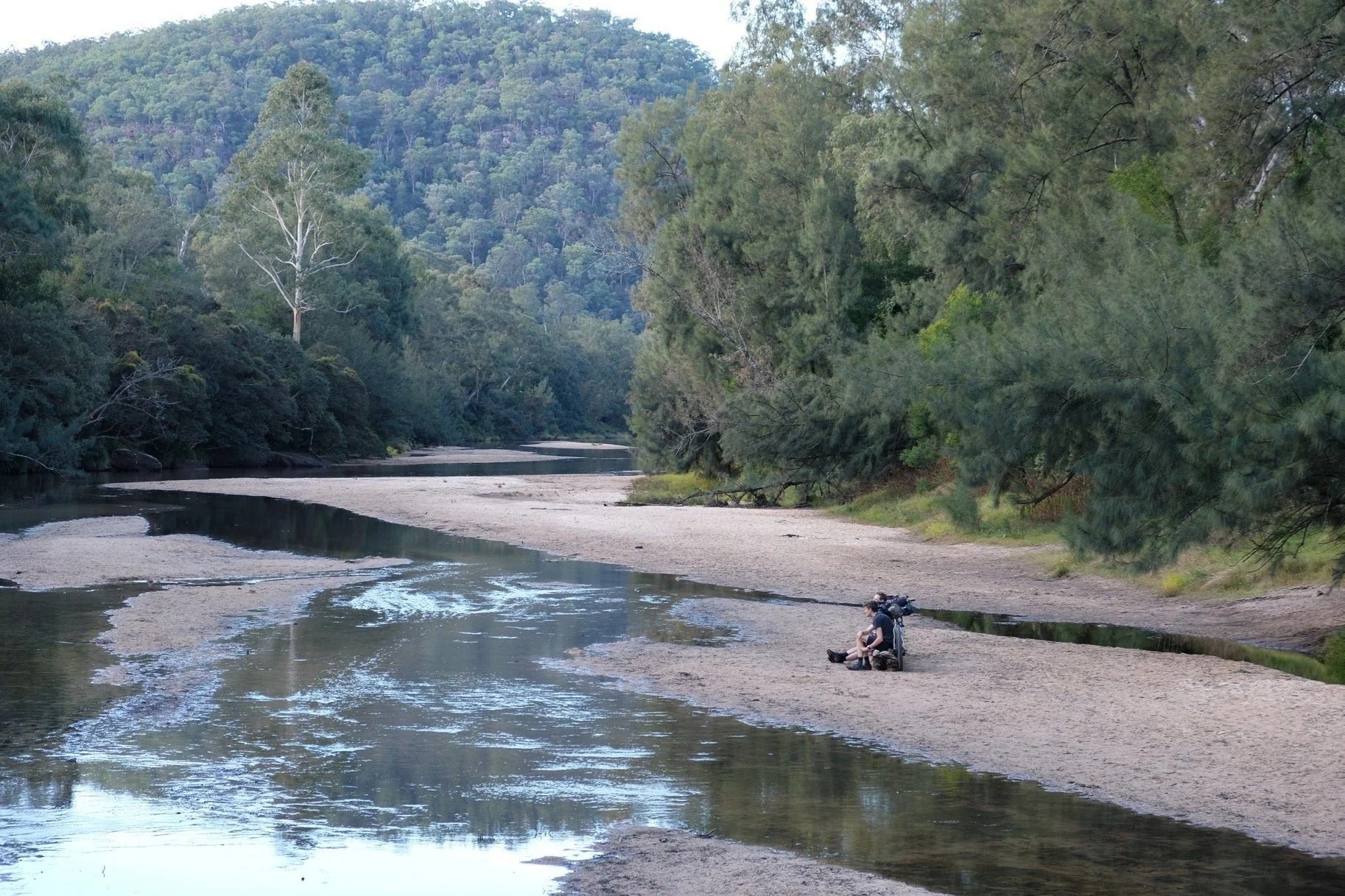 Then follow the river west and north until you encounter some barriers on the track to the Colo Meroo campground. There is a right-of-way across some private properties, and one or two landowners have tried to enforce a "no bicycles" rule to keep people out. It's a legal grey area whether they have the power to do this, but the public is definitely allowed through, and in the interests of preserving access for future travellers, you MUST walk your bikes along the track from this barrier to the campground. If you ride your bike, a resident will see you (they're always watching) and you may jeopardise access (plus they'll probably yell at you). So just walk - it's a very pleasant half-hour walk.